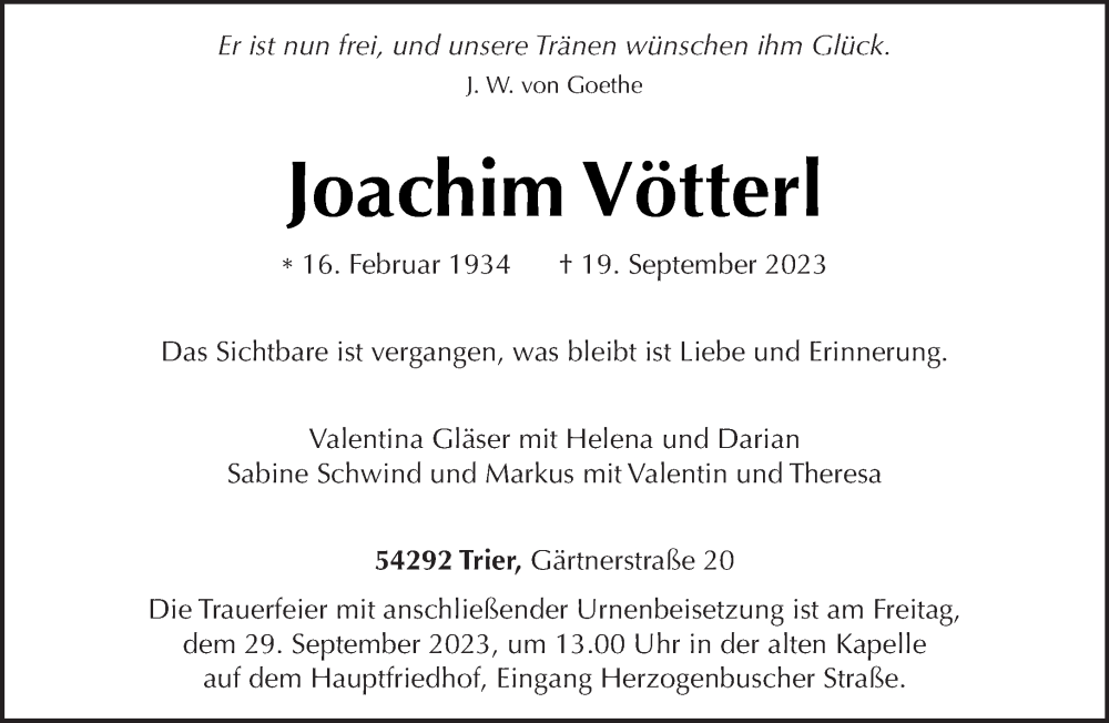 Hier finden Sie alle Traueranzeigen aus der Zeitung, die bisher für Joachim Vötterl erschienen sind. Weitere Traueranzeigen, die in der Zeitung erscheinen, werden hier ebenfalls aufgelistet