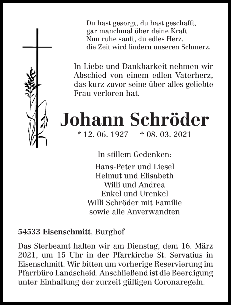 Hier finden Sie alle Traueranzeigen aus der Zeitung, die bisher für Johann Schröder erschienen sind. Weitere Traueranzeigen, die in der Zeitung erscheinen, werden hier ebenfalls aufgelistet