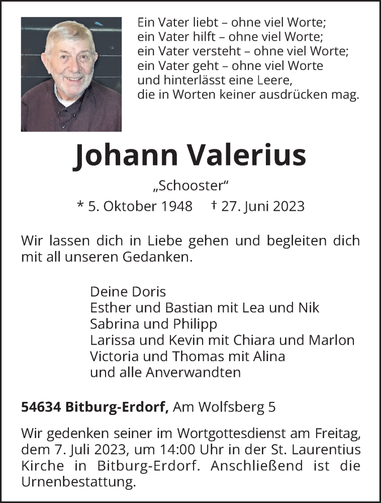 Hier finden Sie alle Traueranzeigen aus der Zeitung, die bisher für Johann Valerius erschienen sind. Weitere Traueranzeigen, die in der Zeitung erscheinen, werden hier ebenfalls aufgelistet