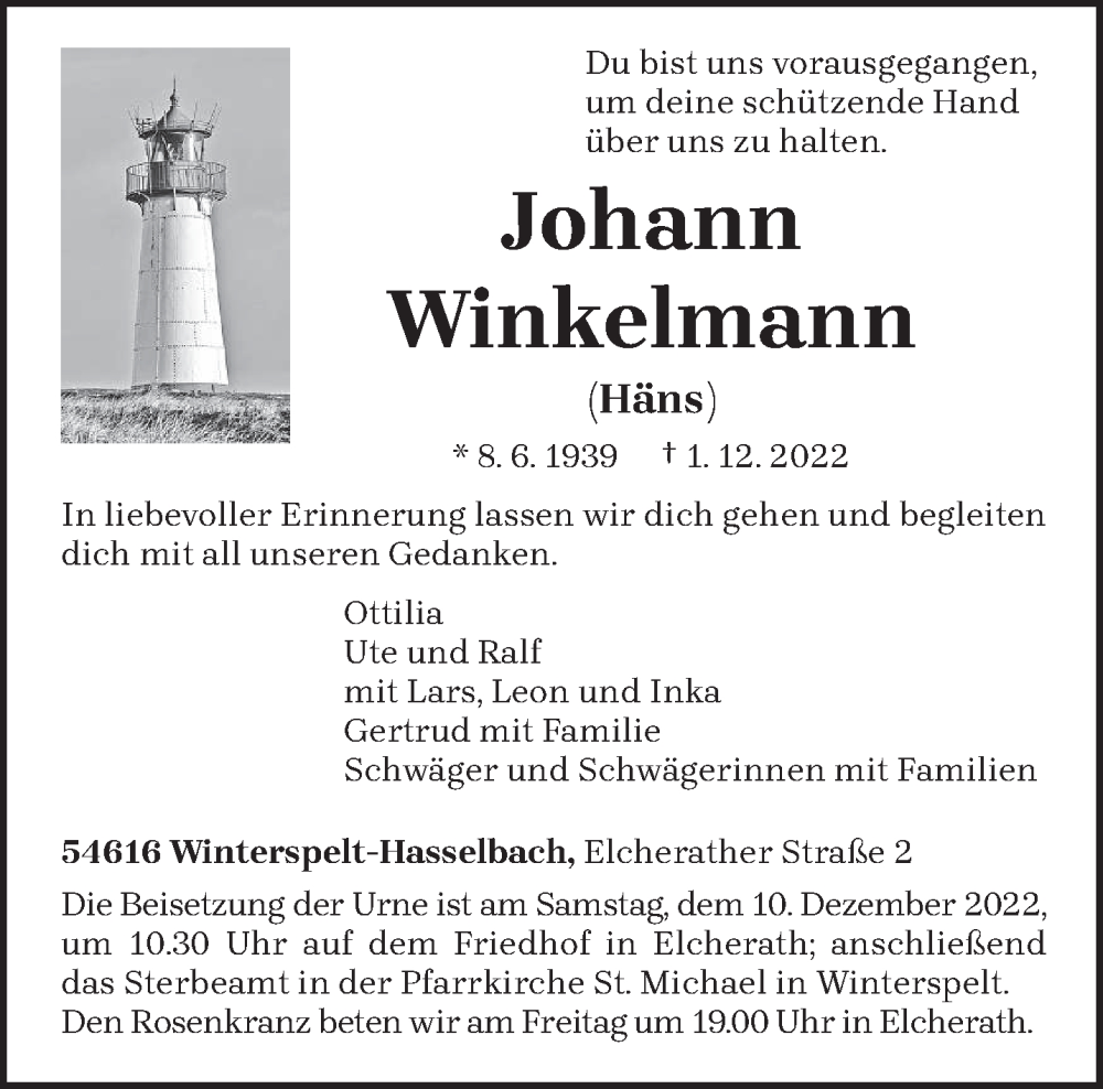 Hier finden Sie alle Traueranzeigen aus der Zeitung, die bisher für Johann Winkelmann erschienen sind. Weitere Traueranzeigen, die in der Zeitung erscheinen, werden hier ebenfalls aufgelistet