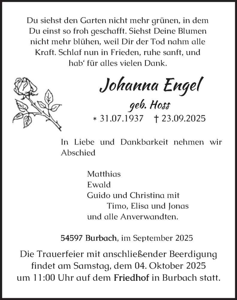 Hier finden Sie alle Traueranzeigen aus der Zeitung, die bisher für Johanna Engel erschienen sind. Weitere Traueranzeigen, die in der Zeitung erscheinen, werden hier ebenfalls aufgelistet