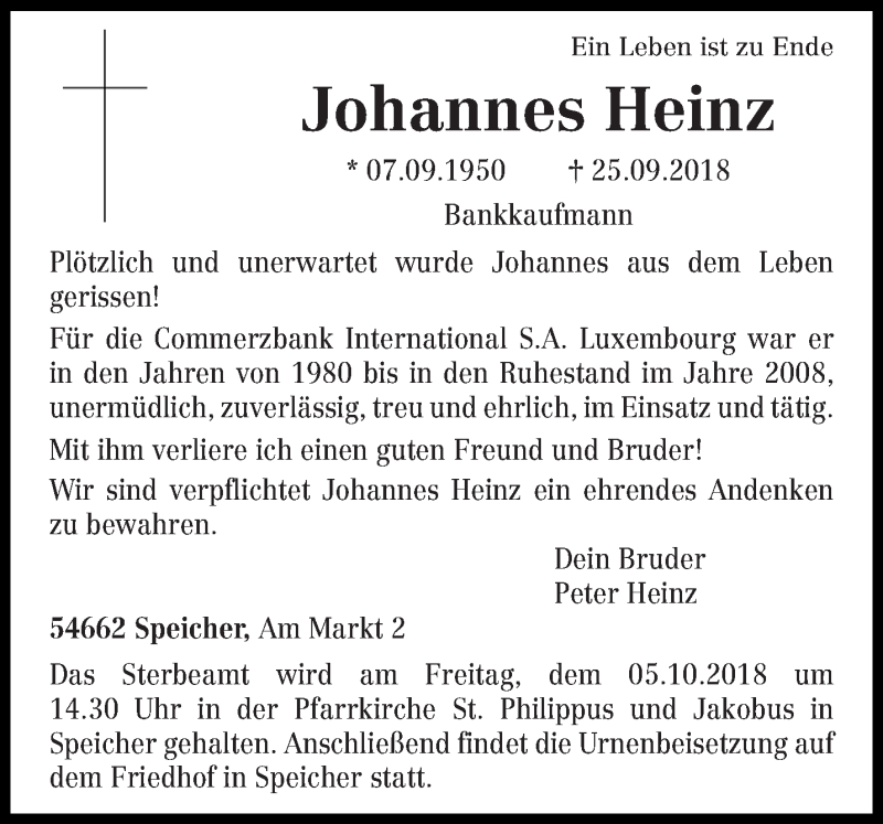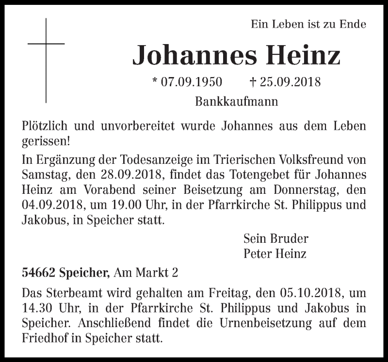 Hier finden Sie alle Traueranzeigen aus der Zeitung, die bisher für Johannes Heinz erschienen sind. Weitere Traueranzeigen, die in der Zeitung erscheinen, werden hier ebenfalls aufgelistet