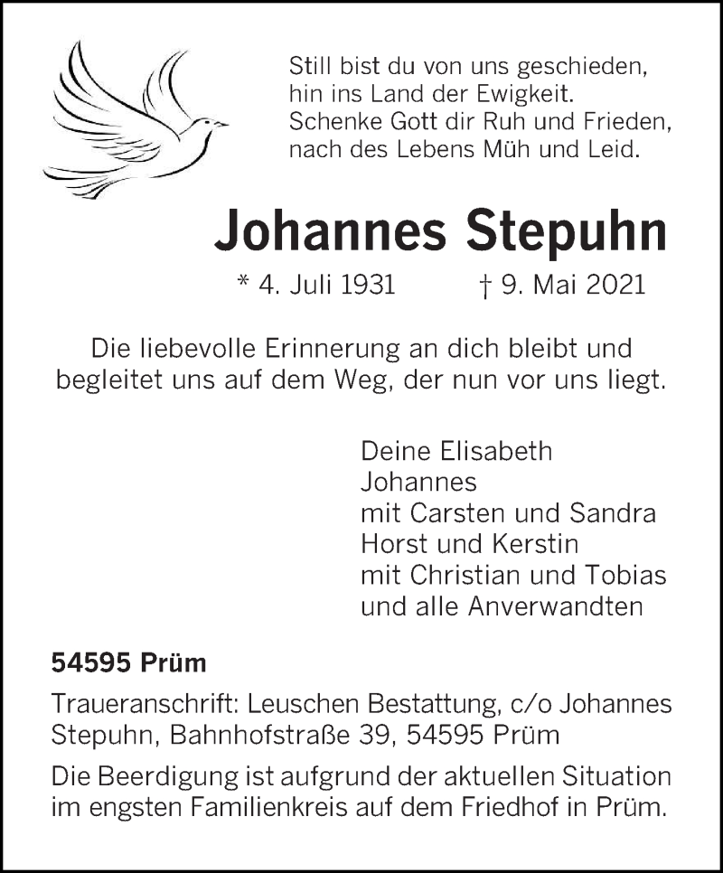 Hier finden Sie alle Traueranzeigen aus der Zeitung, die bisher für Johannes Stepuhn erschienen sind. Weitere Traueranzeigen, die in der Zeitung erscheinen, werden hier ebenfalls aufgelistet