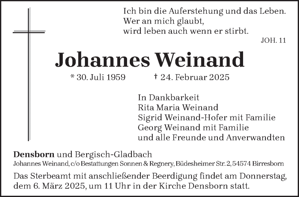 Hier finden Sie alle Traueranzeigen aus der Zeitung, die bisher für Johannes Weinand erschienen sind. Weitere Traueranzeigen, die in der Zeitung erscheinen, werden hier ebenfalls aufgelistet