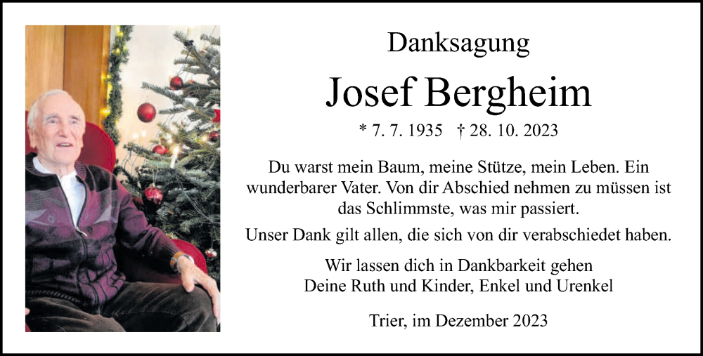 Hier finden Sie alle Traueranzeigen aus der Zeitung, die bisher für Josef Bergheim erschienen sind. Weitere Traueranzeigen, die in der Zeitung erscheinen, werden hier ebenfalls aufgelistet
