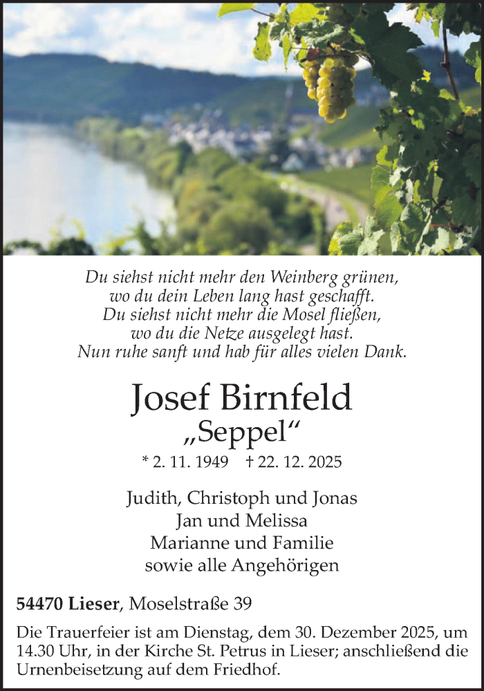 Hier finden Sie alle Traueranzeigen aus der Zeitung, die bisher für Josef Birnfeld erschienen sind. Weitere Traueranzeigen, die in der Zeitung erscheinen, werden hier ebenfalls aufgelistet