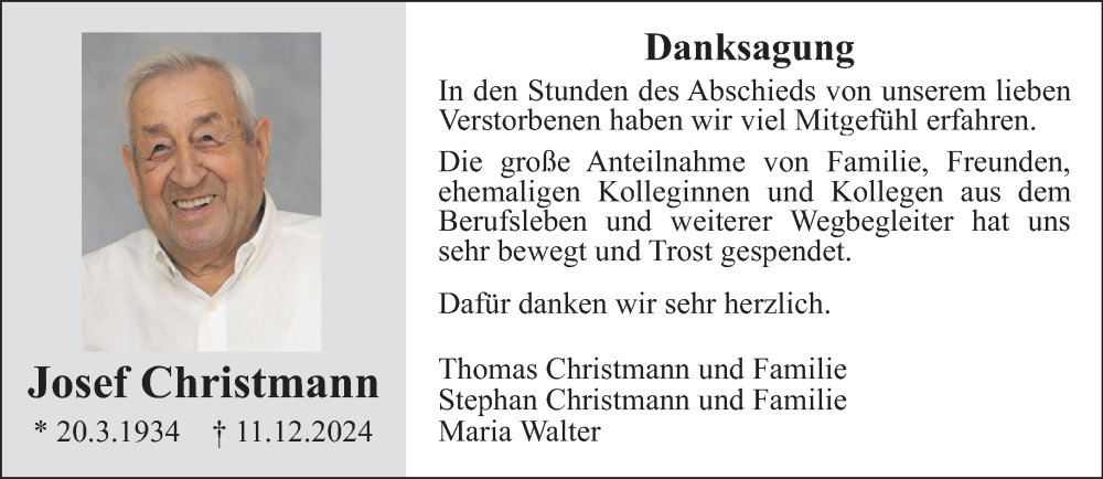 Hier finden Sie alle Traueranzeigen aus der Zeitung, die bisher für Josef Christmann erschienen sind. Weitere Traueranzeigen, die in der Zeitung erscheinen, werden hier ebenfalls aufgelistet