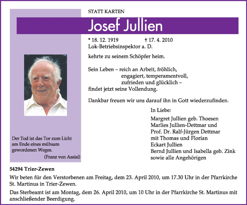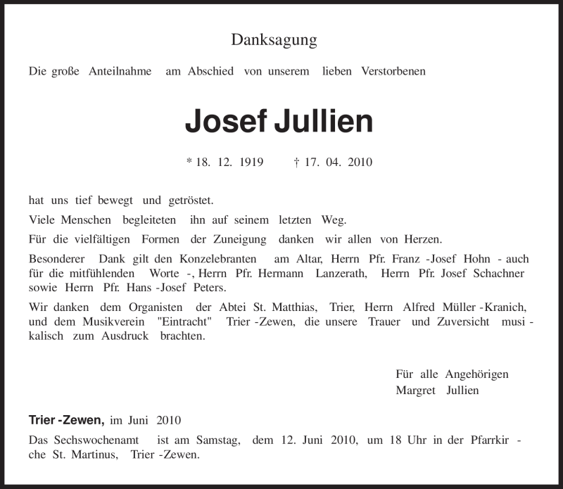 Hier finden Sie alle Traueranzeigen aus der Zeitung, die bisher für Josef Jullien erschienen sind. Weitere Traueranzeigen, die in der Zeitung erscheinen, werden hier ebenfalls aufgelistet