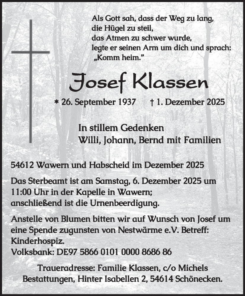 Hier finden Sie alle Traueranzeigen aus der Zeitung, die bisher für Josef Klassen erschienen sind. Weitere Traueranzeigen, die in der Zeitung erscheinen, werden hier ebenfalls aufgelistet
