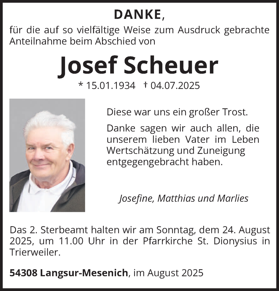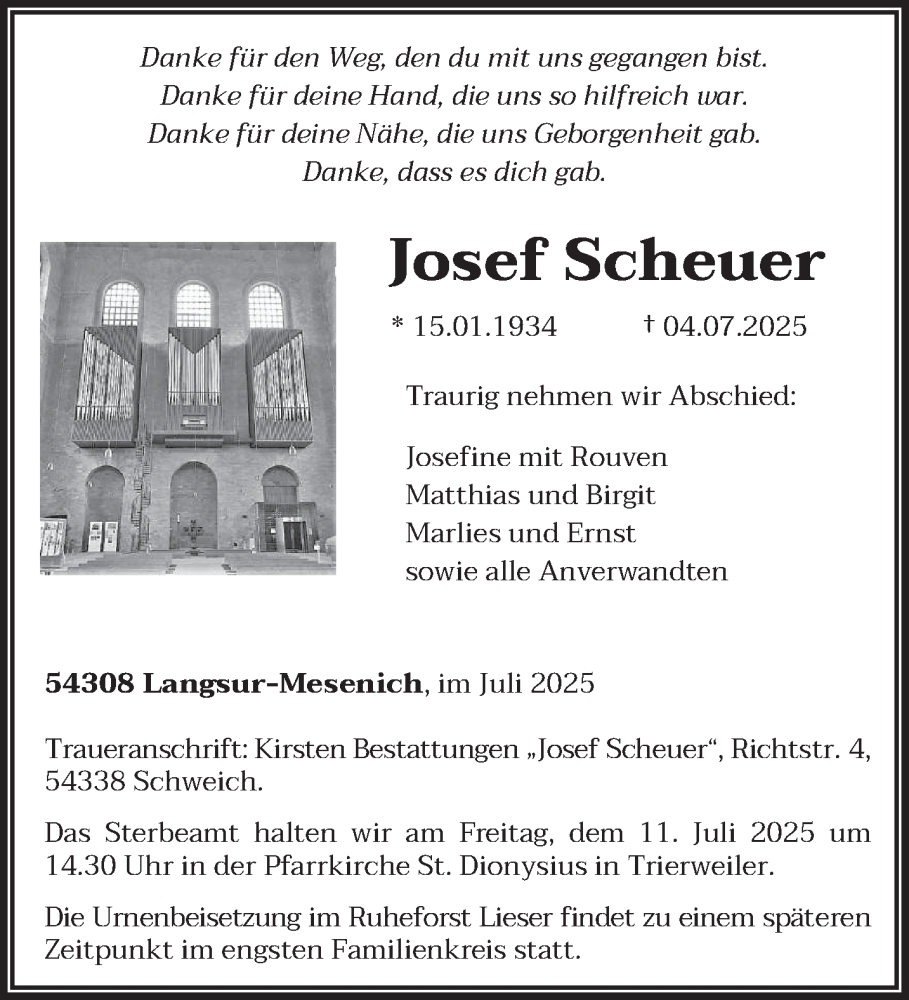 Hier finden Sie alle Traueranzeigen aus der Zeitung, die bisher für Josef Scheuer erschienen sind. Weitere Traueranzeigen, die in der Zeitung erscheinen, werden hier ebenfalls aufgelistet