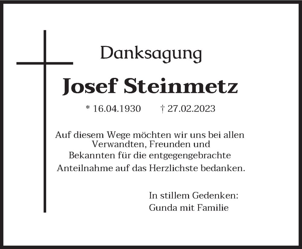 Hier finden Sie alle Traueranzeigen aus der Zeitung, die bisher für Josef Steinmetz erschienen sind. Weitere Traueranzeigen, die in der Zeitung erscheinen, werden hier ebenfalls aufgelistet