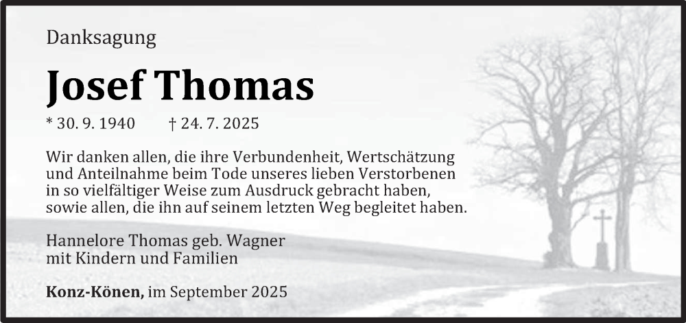 Hier finden Sie alle Traueranzeigen aus der Zeitung, die bisher für Josef Thomas erschienen sind. Weitere Traueranzeigen, die in der Zeitung erscheinen, werden hier ebenfalls aufgelistet
