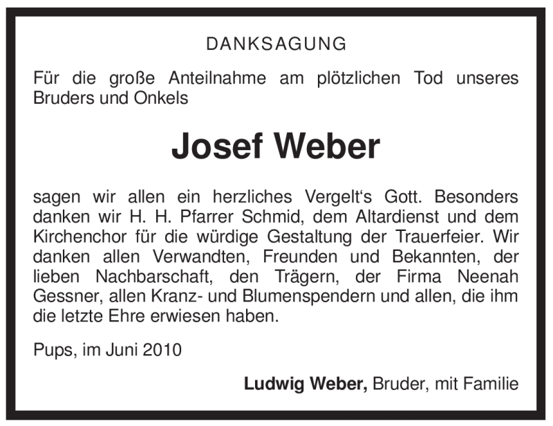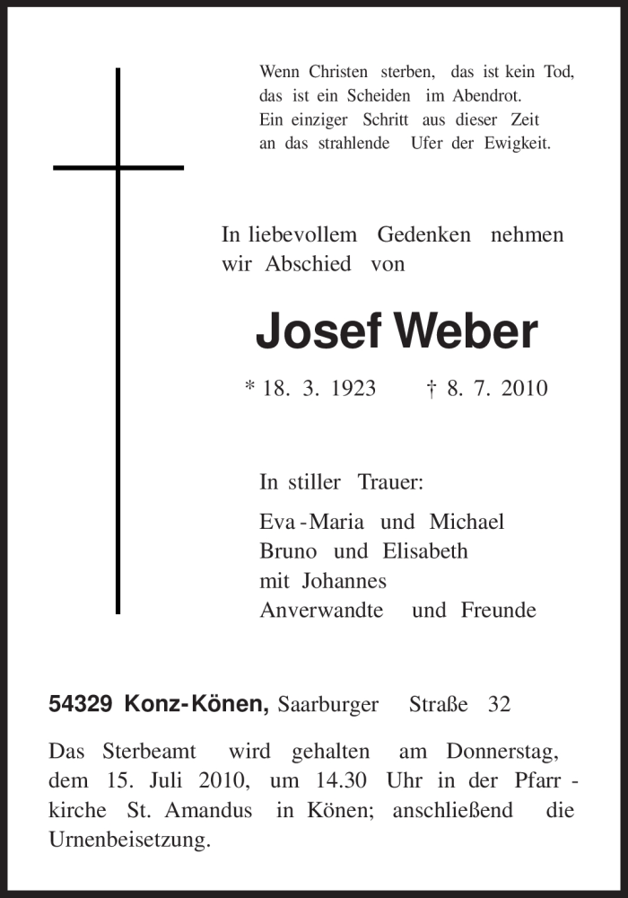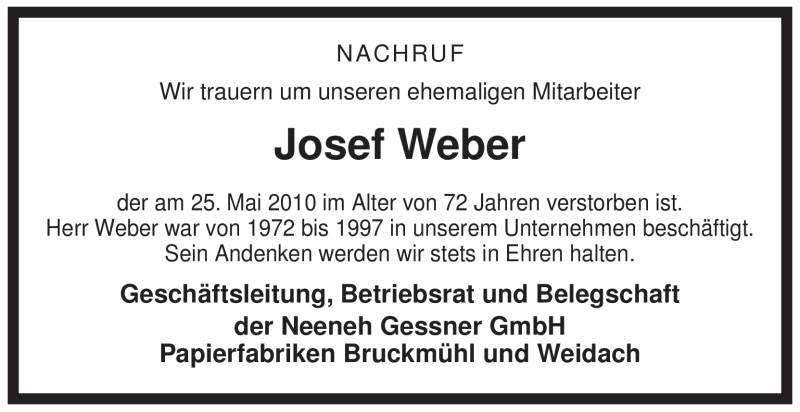 Hier finden Sie alle Traueranzeigen aus der Zeitung, die bisher für Josef Weber erschienen sind. Weitere Traueranzeigen, die in der Zeitung erscheinen, werden hier ebenfalls aufgelistet