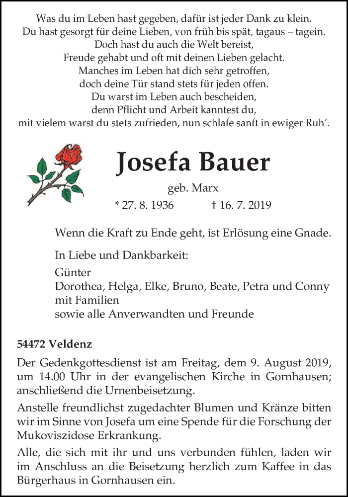 Hier finden Sie alle Traueranzeigen aus der Zeitung, die bisher für Josefa Bauer erschienen sind. Weitere Traueranzeigen, die in der Zeitung erscheinen, werden hier ebenfalls aufgelistet