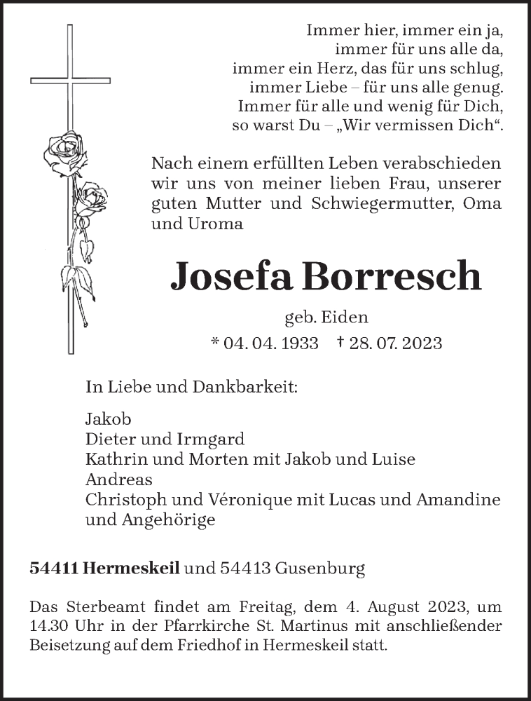 Hier finden Sie alle Traueranzeigen aus der Zeitung, die bisher für Josefa Borresch erschienen sind. Weitere Traueranzeigen, die in der Zeitung erscheinen, werden hier ebenfalls aufgelistet