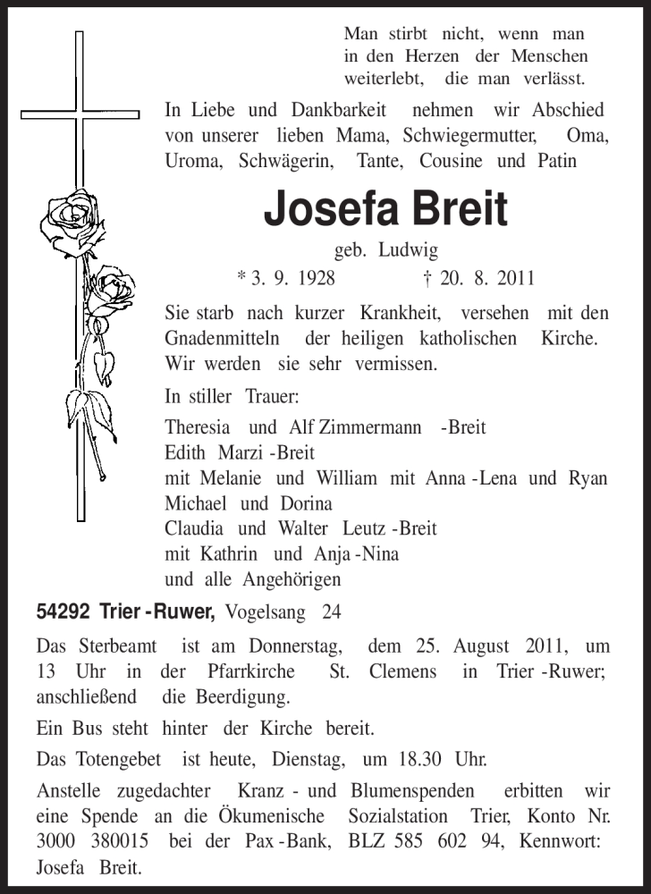 Hier finden Sie alle Traueranzeigen aus der Zeitung, die bisher für Josefa Breit erschienen sind. Weitere Traueranzeigen, die in der Zeitung erscheinen, werden hier ebenfalls aufgelistet