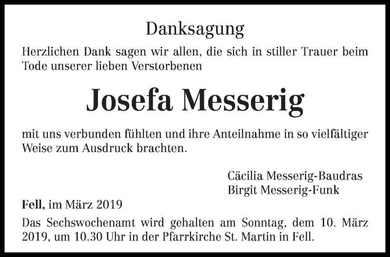 Hier finden Sie alle Traueranzeigen aus der Zeitung, die bisher für Josefa Messerig erschienen sind. Weitere Traueranzeigen, die in der Zeitung erscheinen, werden hier ebenfalls aufgelistet