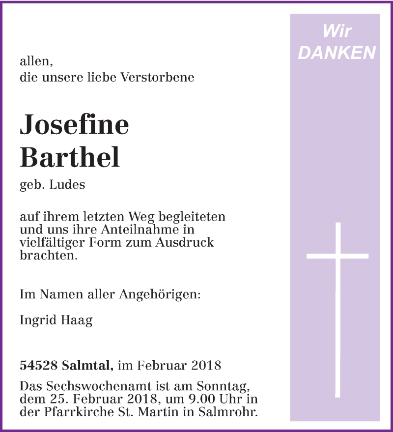 Hier finden Sie alle Traueranzeigen aus der Zeitung, die bisher für Josefine Barthel erschienen sind. Weitere Traueranzeigen, die in der Zeitung erscheinen, werden hier ebenfalls aufgelistet