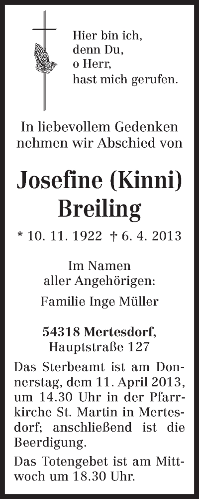 Hier finden Sie alle Traueranzeigen aus der Zeitung, die bisher für Josefine Breiling erschienen sind. Weitere Traueranzeigen, die in der Zeitung erscheinen, werden hier ebenfalls aufgelistet
