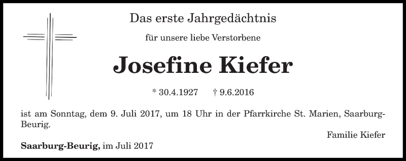 Hier finden Sie alle Traueranzeigen aus der Zeitung, die bisher für Josefine Kiefer erschienen sind. Weitere Traueranzeigen, die in der Zeitung erscheinen, werden hier ebenfalls aufgelistet
