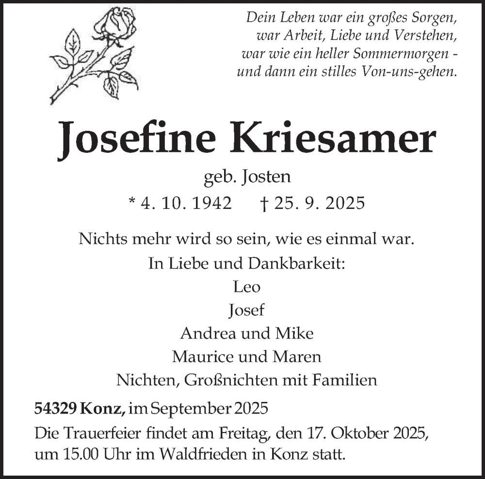 Hier finden Sie alle Traueranzeigen aus der Zeitung, die bisher für Josefine Kriesamer erschienen sind. Weitere Traueranzeigen, die in der Zeitung erscheinen, werden hier ebenfalls aufgelistet