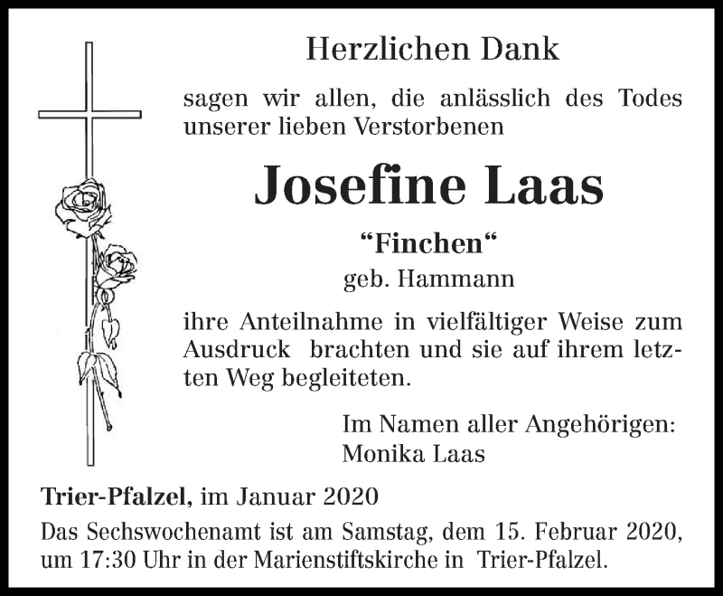 Hier finden Sie alle Traueranzeigen aus der Zeitung, die bisher für Josefine Laas erschienen sind. Weitere Traueranzeigen, die in der Zeitung erscheinen, werden hier ebenfalls aufgelistet