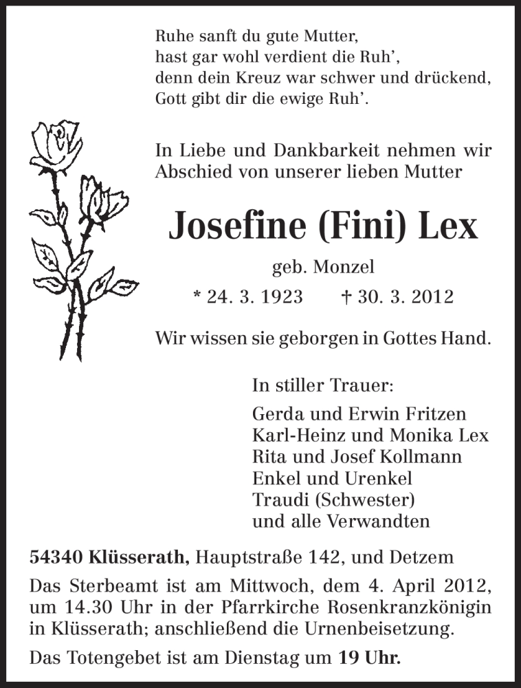 Hier finden Sie alle Traueranzeigen aus der Zeitung, die bisher für Josefine Lex erschienen sind. Weitere Traueranzeigen, die in der Zeitung erscheinen, werden hier ebenfalls aufgelistet