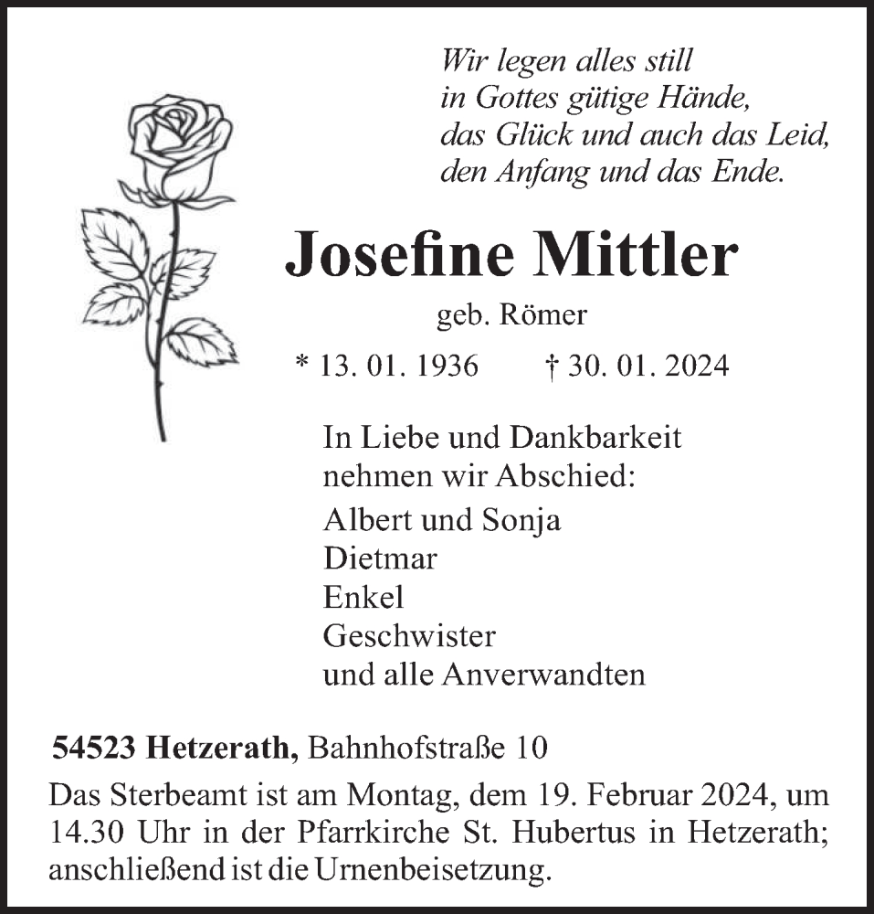 Hier finden Sie alle Traueranzeigen aus der Zeitung, die bisher für Josefine Mittler erschienen sind. Weitere Traueranzeigen, die in der Zeitung erscheinen, werden hier ebenfalls aufgelistet