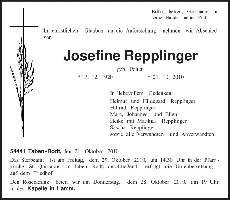 Hier finden Sie alle Traueranzeigen aus der Zeitung, die bisher für Josefine Repplinger erschienen sind. Weitere Traueranzeigen, die in der Zeitung erscheinen, werden hier ebenfalls aufgelistet