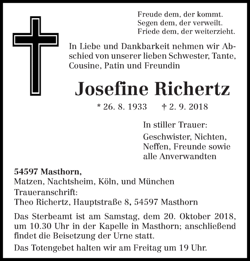 Hier finden Sie alle Traueranzeigen aus der Zeitung, die bisher für Josefine Richertz erschienen sind. Weitere Traueranzeigen, die in der Zeitung erscheinen, werden hier ebenfalls aufgelistet