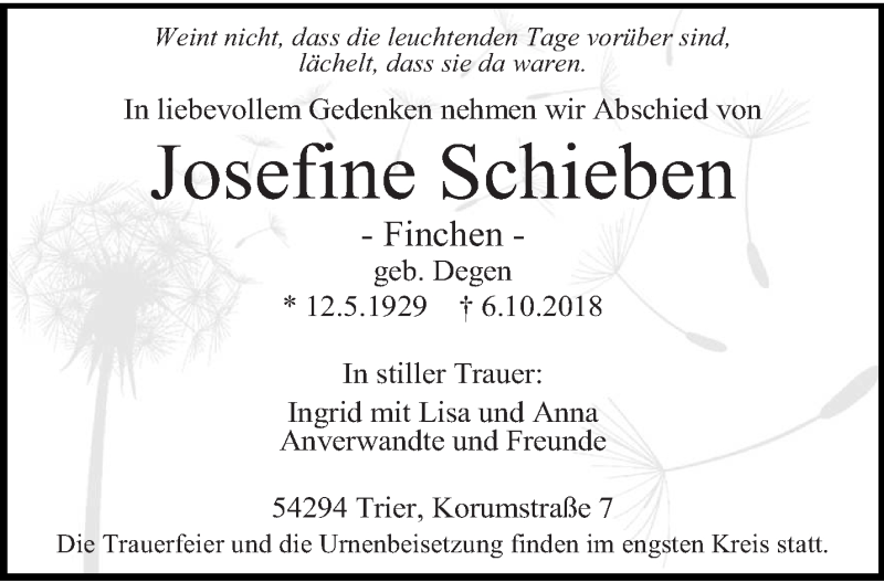 Hier finden Sie alle Traueranzeigen aus der Zeitung, die bisher für Josefine Schieben erschienen sind. Weitere Traueranzeigen, die in der Zeitung erscheinen, werden hier ebenfalls aufgelistet