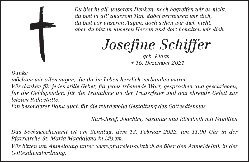 Hier finden Sie alle Traueranzeigen aus der Zeitung, die bisher für Josefine Schiffer erschienen sind. Weitere Traueranzeigen, die in der Zeitung erscheinen, werden hier ebenfalls aufgelistet