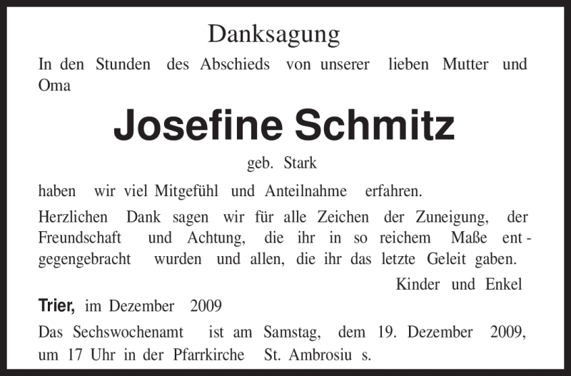 Hier finden Sie alle Traueranzeigen aus der Zeitung, die bisher für Josefine Schmitz erschienen sind. Weitere Traueranzeigen, die in der Zeitung erscheinen, werden hier ebenfalls aufgelistet