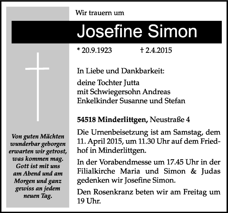 Hier finden Sie alle Traueranzeigen aus der Zeitung, die bisher für Josefine Simon erschienen sind. Weitere Traueranzeigen, die in der Zeitung erscheinen, werden hier ebenfalls aufgelistet