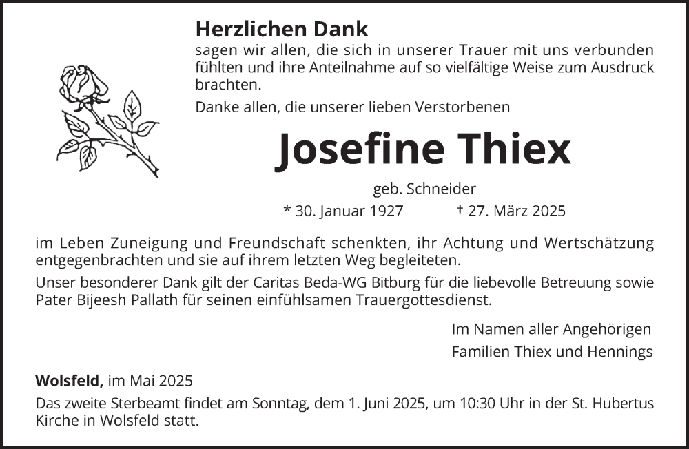 Hier finden Sie alle Traueranzeigen aus der Zeitung, die bisher für Josefine Thiex erschienen sind. Weitere Traueranzeigen, die in der Zeitung erscheinen, werden hier ebenfalls aufgelistet