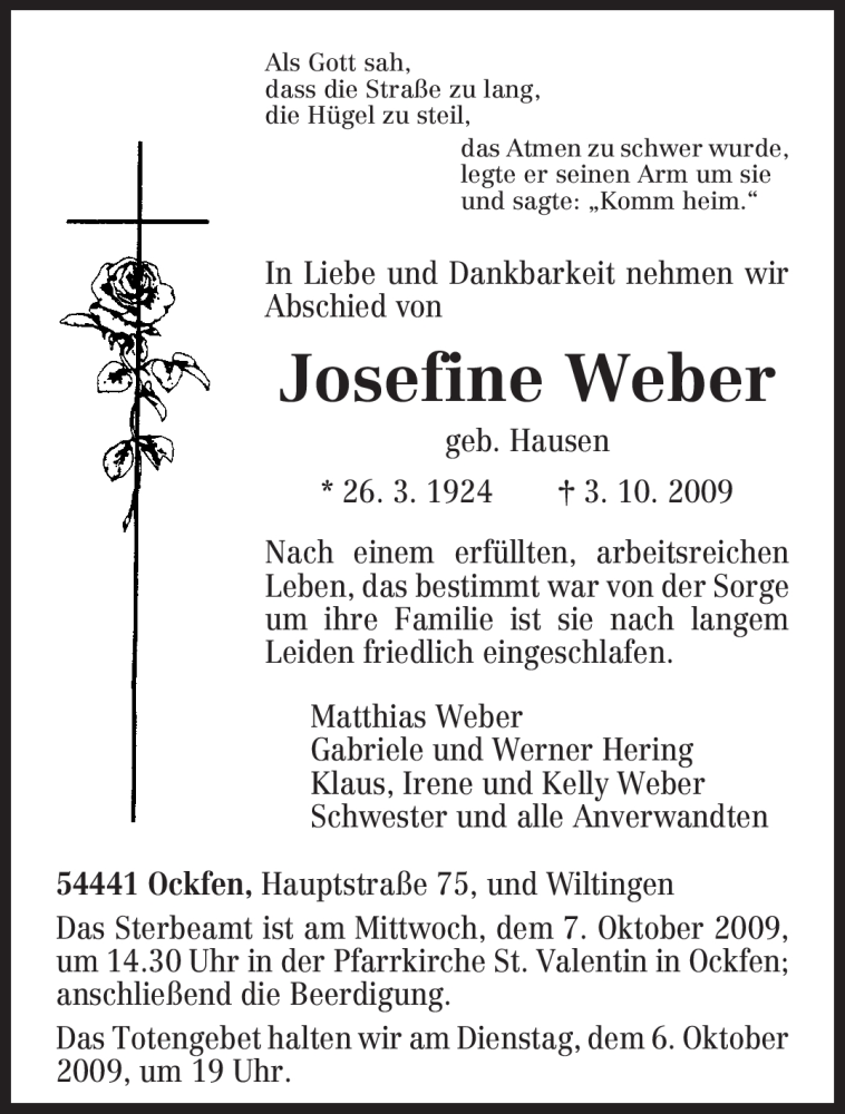 Hier finden Sie alle Traueranzeigen aus der Zeitung, die bisher für Josefine Weber erschienen sind. Weitere Traueranzeigen, die in der Zeitung erscheinen, werden hier ebenfalls aufgelistet