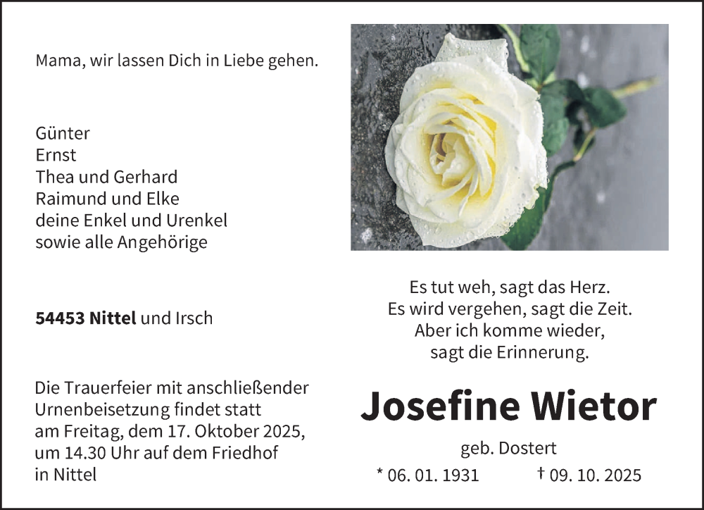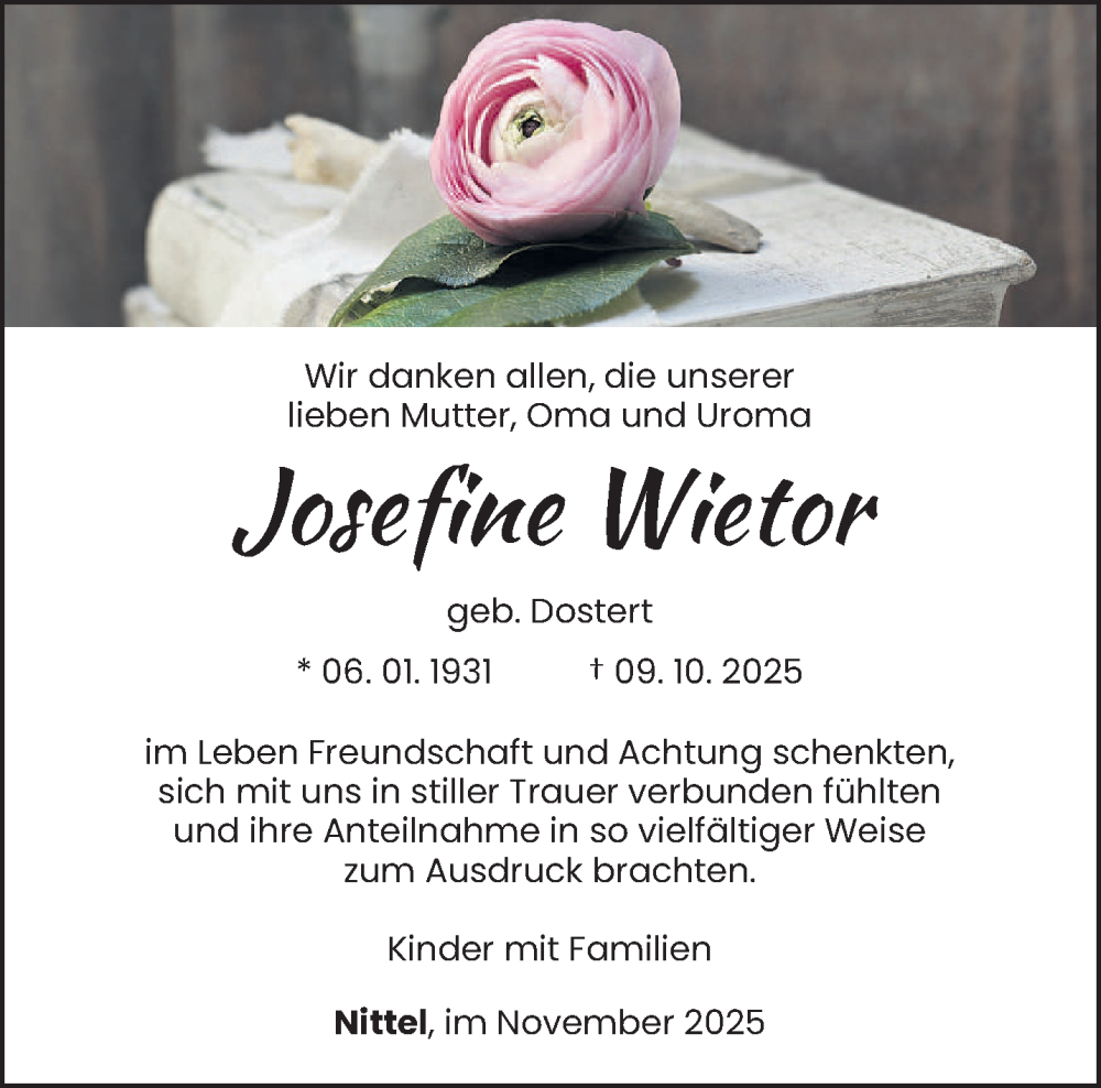 Hier finden Sie alle Traueranzeigen aus der Zeitung, die bisher für Josefine Wietor erschienen sind. Weitere Traueranzeigen, die in der Zeitung erscheinen, werden hier ebenfalls aufgelistet