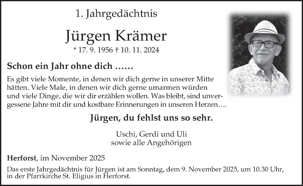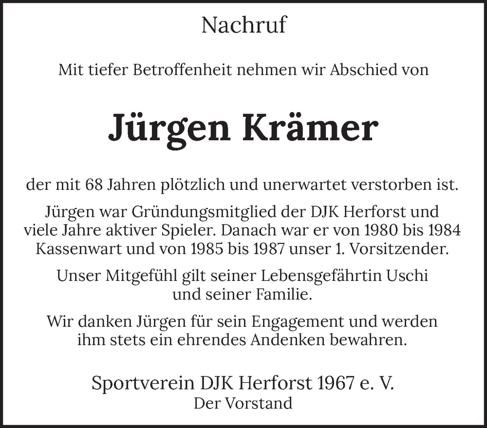 Hier finden Sie alle Traueranzeigen aus der Zeitung, die bisher für Jürgen Krämer erschienen sind. Weitere Traueranzeigen, die in der Zeitung erscheinen, werden hier ebenfalls aufgelistet