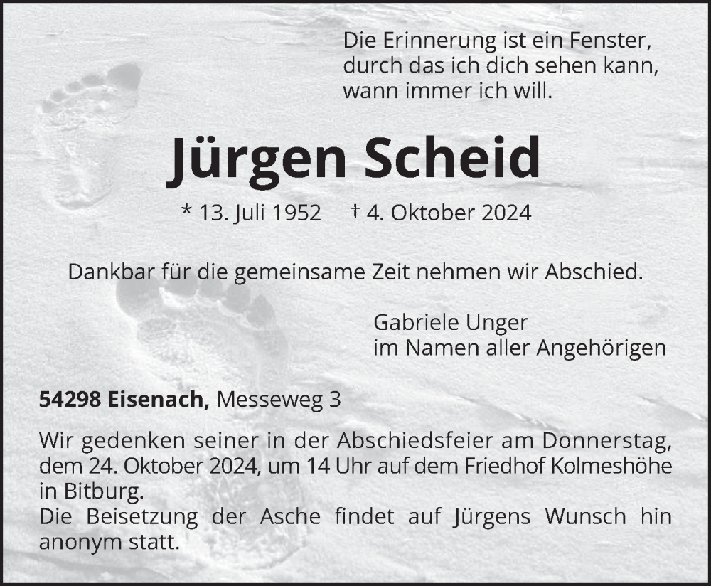 Hier finden Sie alle Traueranzeigen aus der Zeitung, die bisher für Jürgen Scheid erschienen sind. Weitere Traueranzeigen, die in der Zeitung erscheinen, werden hier ebenfalls aufgelistet