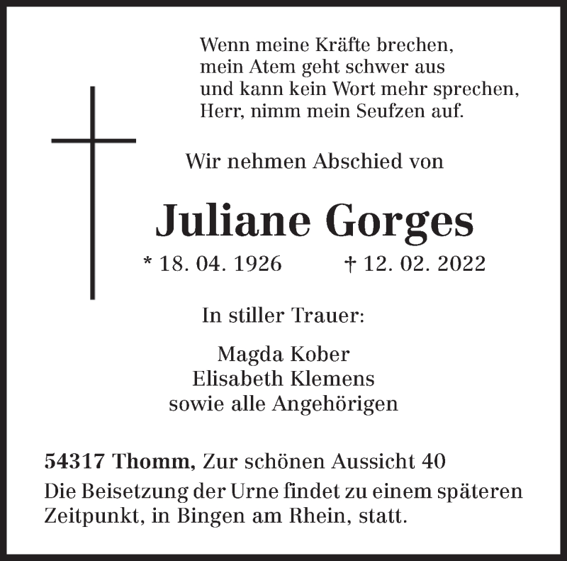 Hier finden Sie alle Traueranzeigen aus der Zeitung, die bisher für Juliane Gorges erschienen sind. Weitere Traueranzeigen, die in der Zeitung erscheinen, werden hier ebenfalls aufgelistet