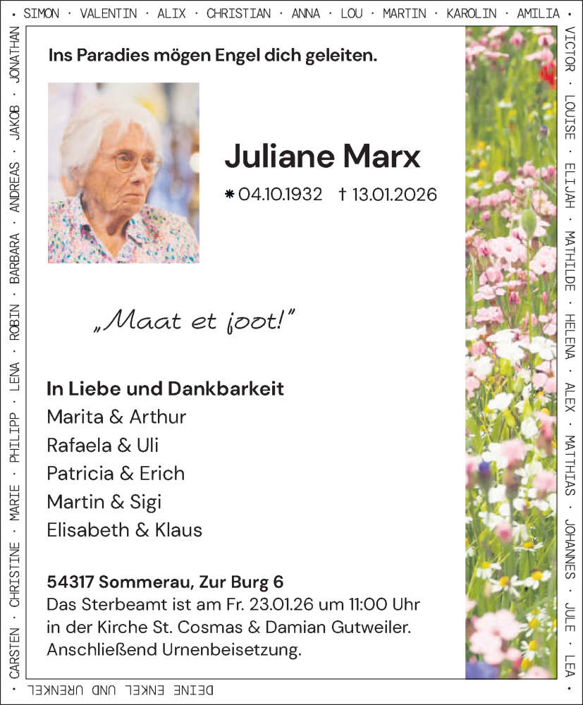 Hier finden Sie alle Traueranzeigen aus der Zeitung, die bisher für Juliane Marx erschienen sind. Weitere Traueranzeigen, die in der Zeitung erscheinen, werden hier ebenfalls aufgelistet