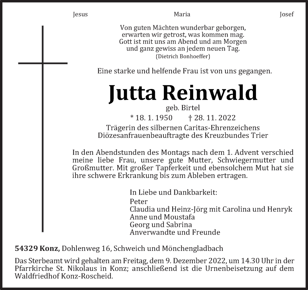 Hier finden Sie alle Traueranzeigen aus der Zeitung, die bisher für Jutta Reinwald erschienen sind. Weitere Traueranzeigen, die in der Zeitung erscheinen, werden hier ebenfalls aufgelistet