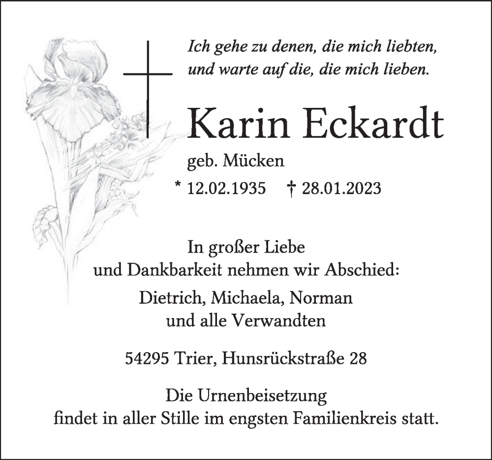 Hier finden Sie alle Traueranzeigen aus der Zeitung, die bisher für Karin Eckardt erschienen sind. Weitere Traueranzeigen, die in der Zeitung erscheinen, werden hier ebenfalls aufgelistet