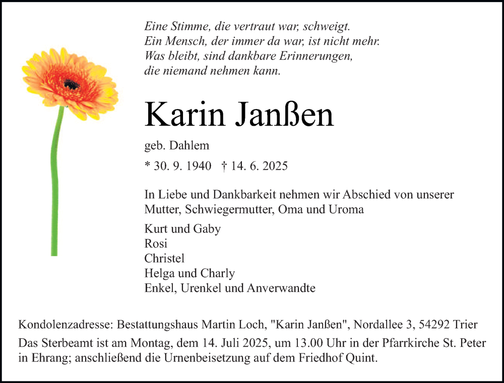 Hier finden Sie alle Traueranzeigen aus der Zeitung, die bisher für Karin Janßen erschienen sind. Weitere Traueranzeigen, die in der Zeitung erscheinen, werden hier ebenfalls aufgelistet