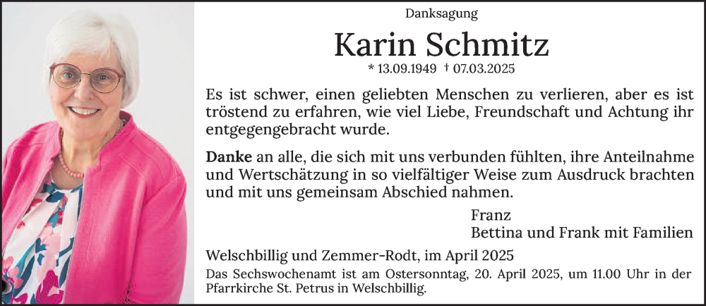 Hier finden Sie alle Traueranzeigen aus der Zeitung, die bisher für Karin Schmitz erschienen sind. Weitere Traueranzeigen, die in der Zeitung erscheinen, werden hier ebenfalls aufgelistet