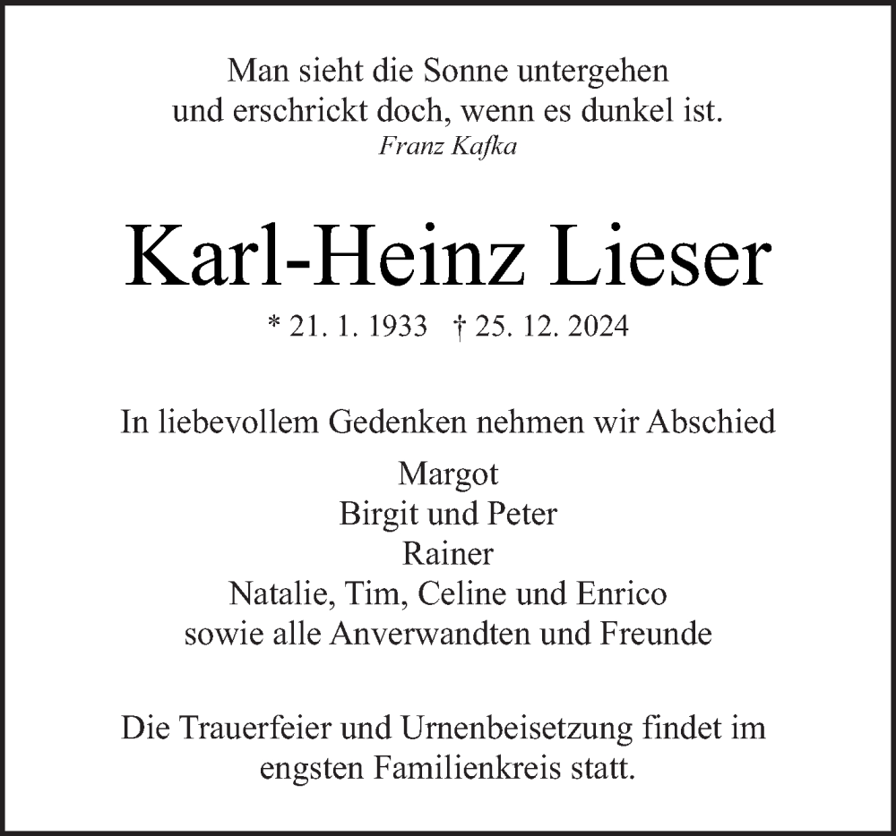 Hier finden Sie alle Traueranzeigen aus der Zeitung, die bisher für Karl-Heinz Lieser erschienen sind. Weitere Traueranzeigen, die in der Zeitung erscheinen, werden hier ebenfalls aufgelistet