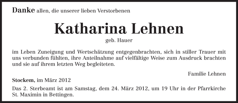 Hier finden Sie alle Traueranzeigen aus der Zeitung, die bisher für Katharina Lehnen erschienen sind. Weitere Traueranzeigen, die in der Zeitung erscheinen, werden hier ebenfalls aufgelistet