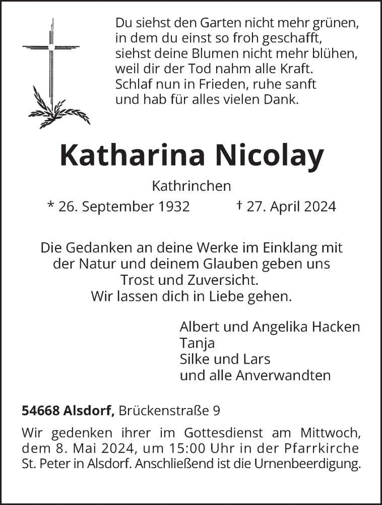 Hier finden Sie alle Traueranzeigen aus der Zeitung, die bisher für Katharina Nicolay erschienen sind. Weitere Traueranzeigen, die in der Zeitung erscheinen, werden hier ebenfalls aufgelistet