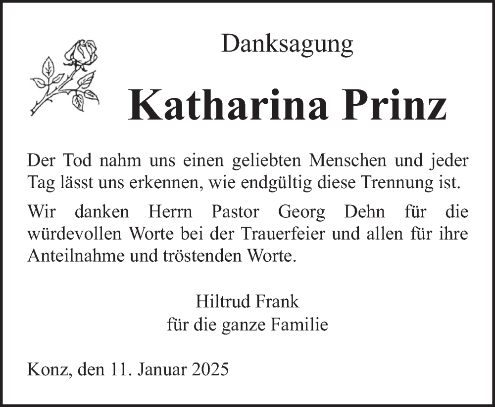 Hier finden Sie alle Traueranzeigen aus der Zeitung, die bisher für Katharina Prinz erschienen sind. Weitere Traueranzeigen, die in der Zeitung erscheinen, werden hier ebenfalls aufgelistet