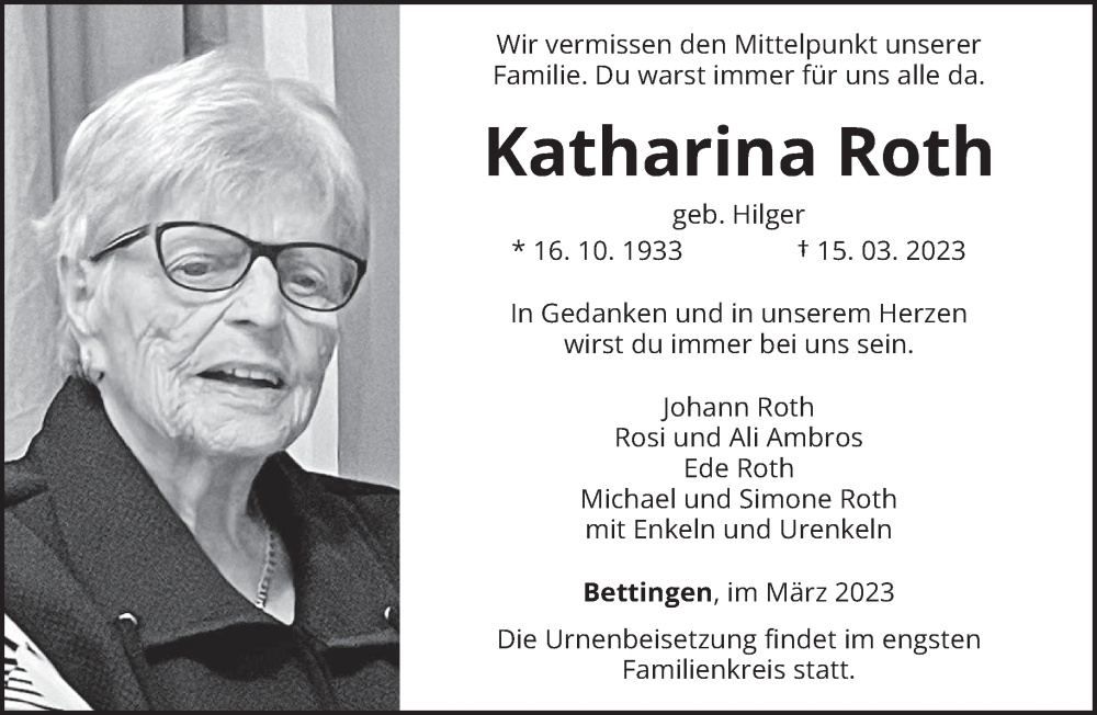 Hier finden Sie alle Traueranzeigen aus der Zeitung, die bisher für Katharina Roth erschienen sind. Weitere Traueranzeigen, die in der Zeitung erscheinen, werden hier ebenfalls aufgelistet